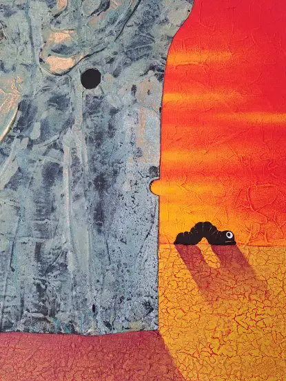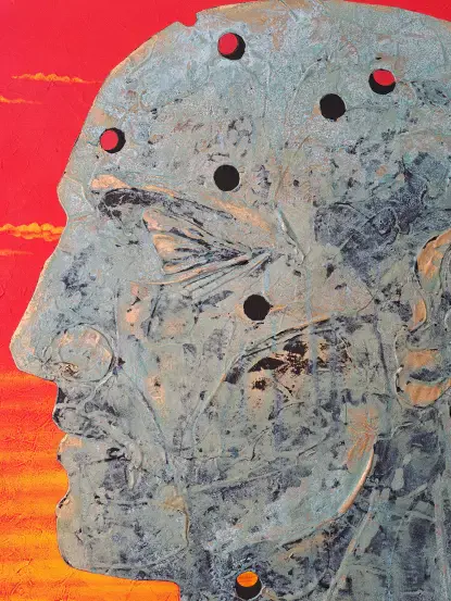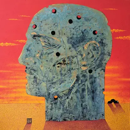 "Ruins of Consciousness" This provocative piece is a philosophical journey through the layers of the human psyche. At its center stands a monumental profile, its surface resembling weathered patina or ancient stone—a symbol of accumulated experience and resilience. The piercing "voids" and fragmented textures reveal a fragile architecture of thought, where memories fade, leaving space for emptiness or new manifestations. The intense red background and cracked earth evoke a sense of existential isolation, while the small figure in the corner emphasizes the vast scale of our inner world compared to objective reality. "Ruins of Consciousness" is not merely a portrait of decay, but an exploration of transformation. The painting invites the viewer to ask: what remains of us when the outer layers are stripped away? It is a perfect centerpiece for collectors who value art with deep psychological resonance and striking visual contrast.